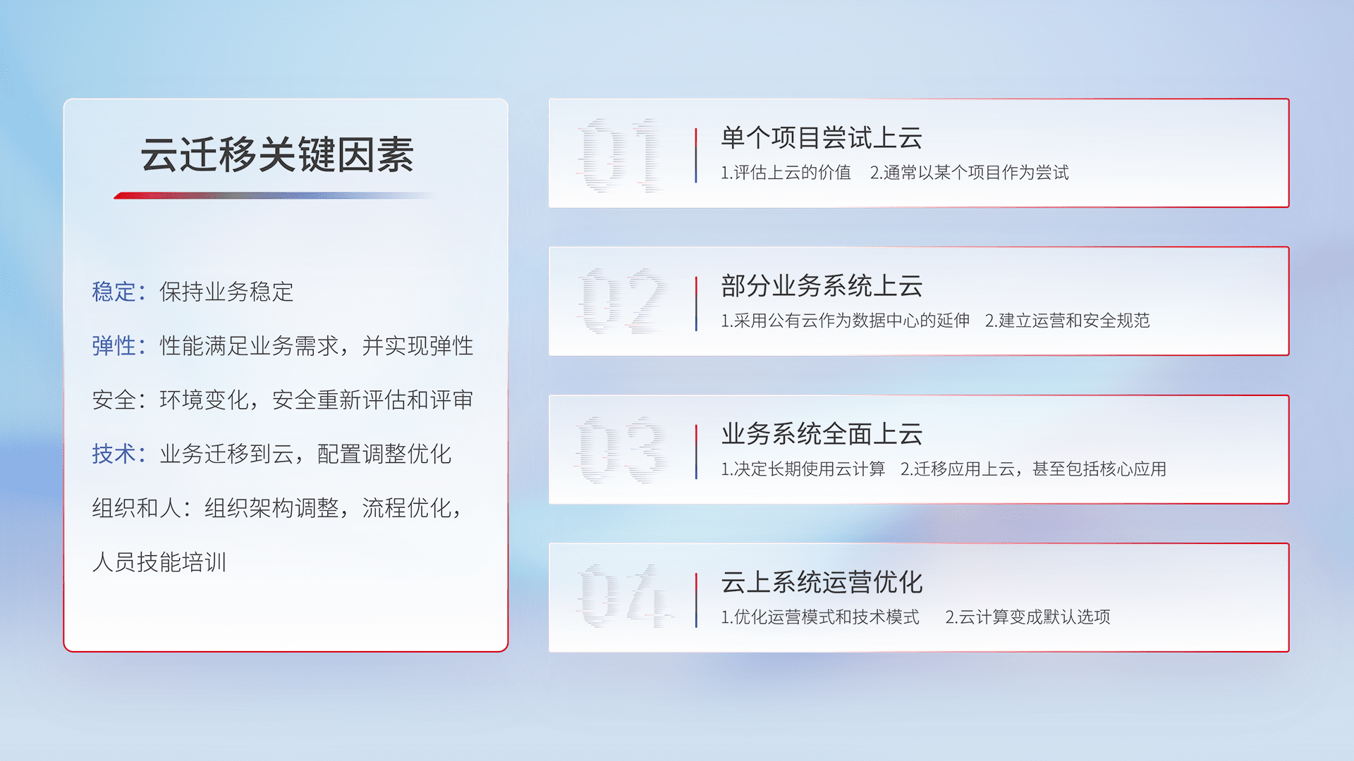结合实际业务,,从规划设计、、、云平台选型、、云原生改造、、、、数据迁移、、集成交付,,,迁移全过程为客户识别最佳上云路径,,,做好风险识别管理,,,,设计网络架构、、、、身份权限、、、、安全审计合规、、、、操作审计、、日志审计、、、、监控告警策略、、、多站点容灾设计等,,,对云上基础设施进行整体规划,,,,提升IT治理水平,,,以满足弹性、、、高可用、、、、高性能的需求。。。