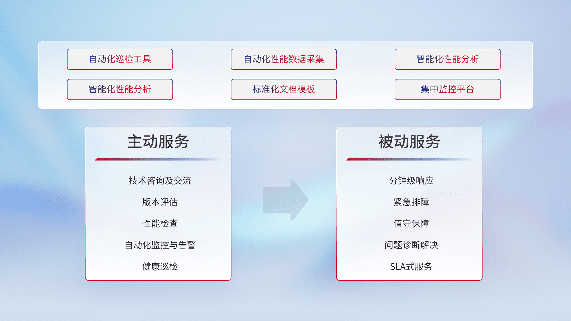 智能化工具和标准化文档,,保障服务质量,,提供主动服务(包含技术咨询、、、、版本评估、、、、性能检查、、、自动化监控与告警、、、健康巡检)和被动服务包含(分钟级响应、、、、紧急排障、、、值守保障、、、问题诊断解决、、SLA服务)。。。